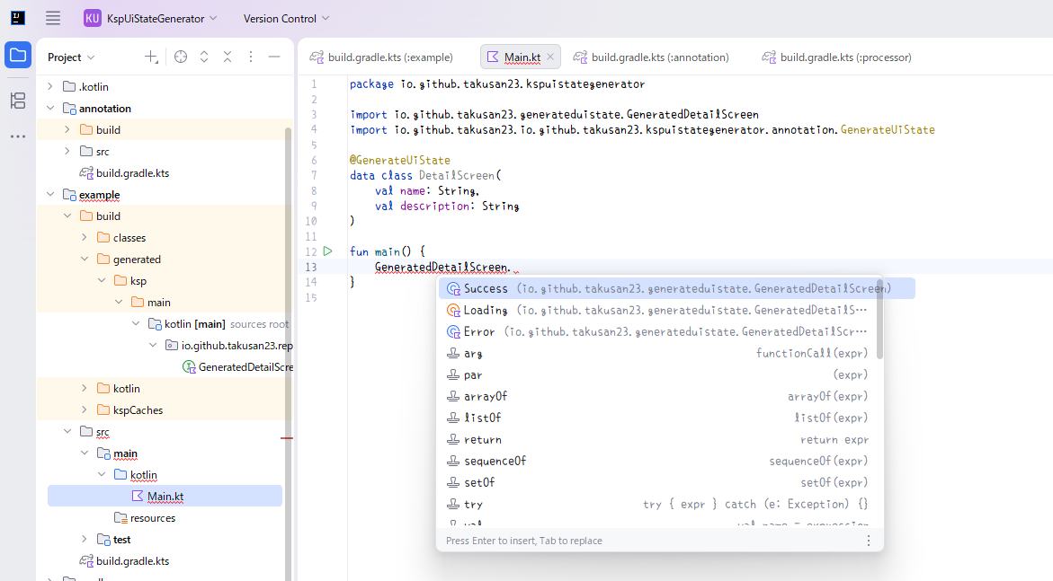 任意のUI Stateのdata classを元に、Loading、Success、Errorを自動生成してみようかと。もっといい例が欲しかった。