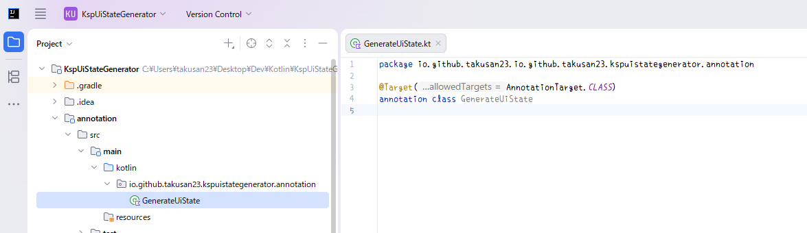 annotation class GenerateUiStateこれだけです。つぎはKSP側を