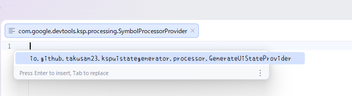 ファイルの中身ですが、GenerateUiStateProviderの名前を完全修飾名で書くだけです。パッケージ名+クラス名