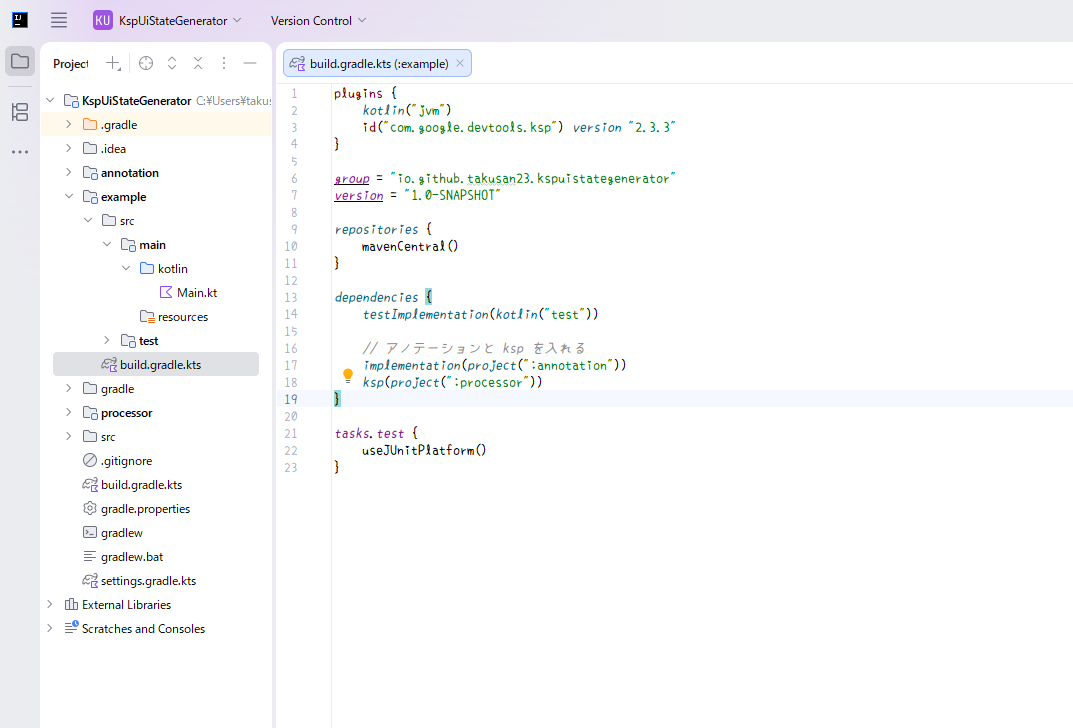 できたら、build.gradle.ktsへkspライブラリを入れ、annotationモジュールと、ksp()としてprocessorモジュールを読み込むようにします。