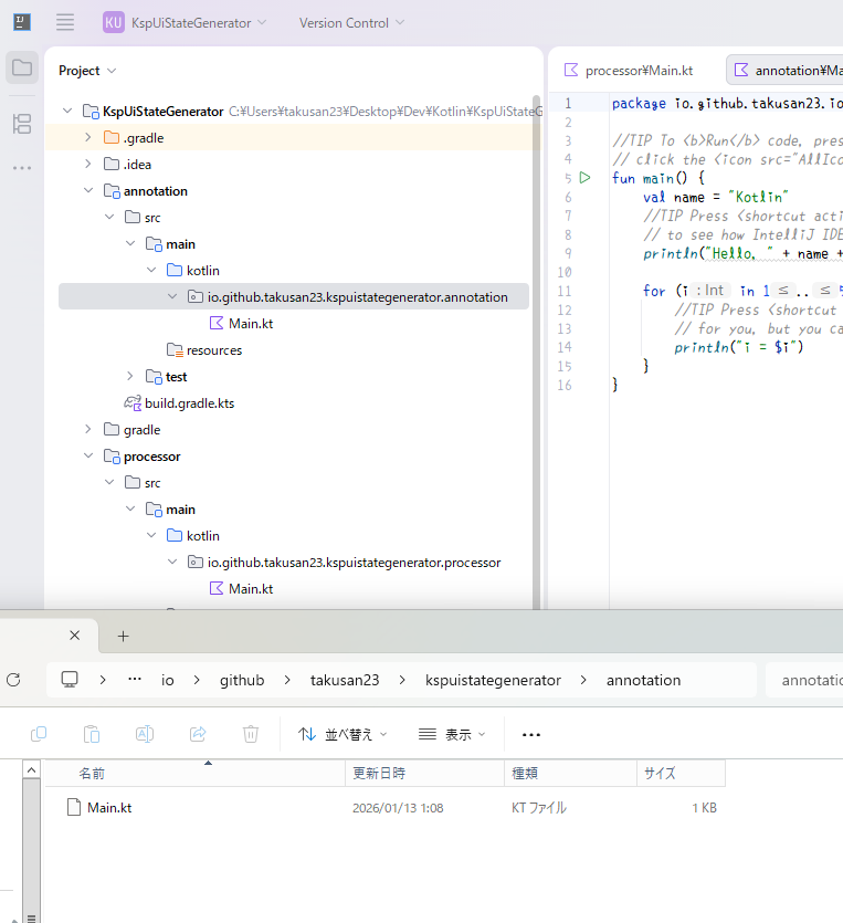 最初かあるMain.ktとかは使わないので消して、annotationパッケージにアノテーションを置く.ktファイルを作りました。GenerateUiState.kt