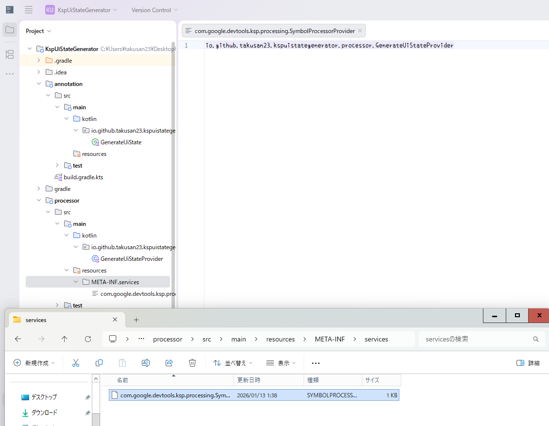 忘れないうちに次にやることは、resourcesフォルダにファイルを置くことです。resourcesフォルダにMETA-INFフォルダを作り、その中にservicesフォルダを作り、その中にcom.google.devtools.ksp.processing.SymbolProcessorProviderという名前のテキストファイルを作ります。